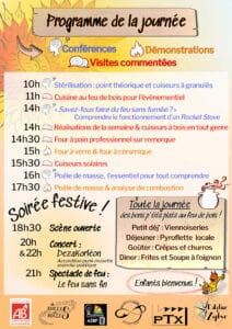 inscription obligatoire pour participer à la semaine, sur HelloAsso.  Chantiers tous les jours du lundi au vendredi midi, 9h-18h Espace bricolage ouvert en semi-autonomie, viens réaliser tes projets (ce n’est pas un stage, à toi de nous proposer ton projet lors de ton inscription). Inscription : rencontrespyro[at)feufollet.org L’espace atelier est réservé aux bricoleur·euses averti·es  Cuisine 100% feu de bois, tous les jours, 9h-12h et/ou 16h-19h Possibilité d’apprendre à cuisiner au feu de bois et découvrir les différents appareils de cuisson. Tables rondes, tous les jours, horaires modulables et à compléter pendant la semaine Démonstrations et partage de savoir-faire : Fabrication de céramique, démonstration de cuisine solaire… Tous les soirs : des temps conviviaux, Jeux, PyrOlympiades
